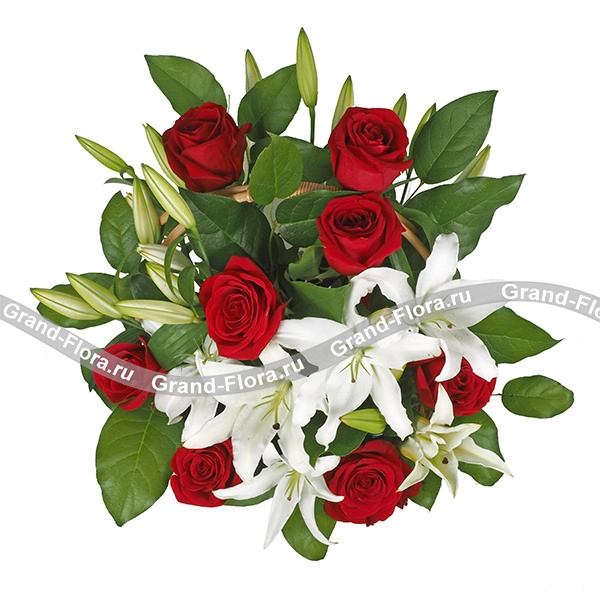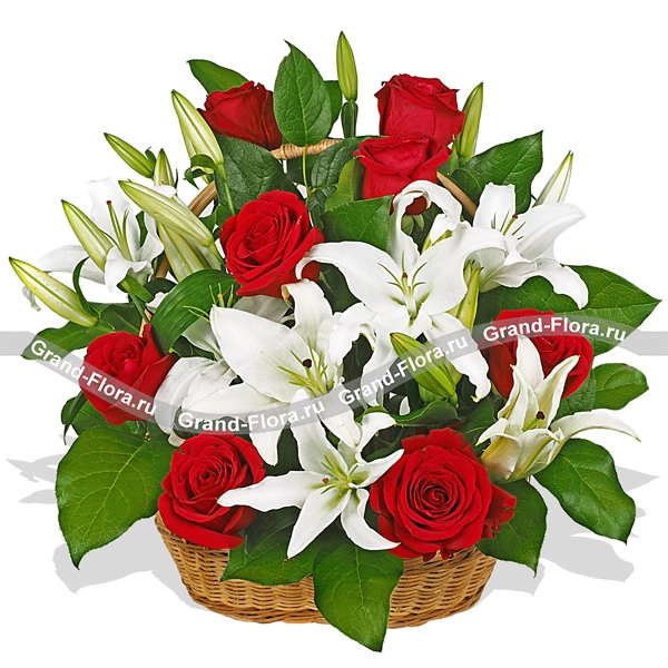 Стандартный (на фото): роза красная (50 см) - 9 шт., лилия белая - 2 шт., рускус, оазис, корзина.