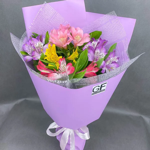 Букет состоит из альстромерии, которую еще называют перуанской лилией из-за внешнего сходства, разнообразное цветовое сочетание, в окружении декоративной зелени. Диаметр букета от 25см до 50см, в зависимости от выбранного варианты букета.  Букет перевязан изящным розовым бантом. Обращаем Ваше внимание, что состав и оформление букета может отличаться.